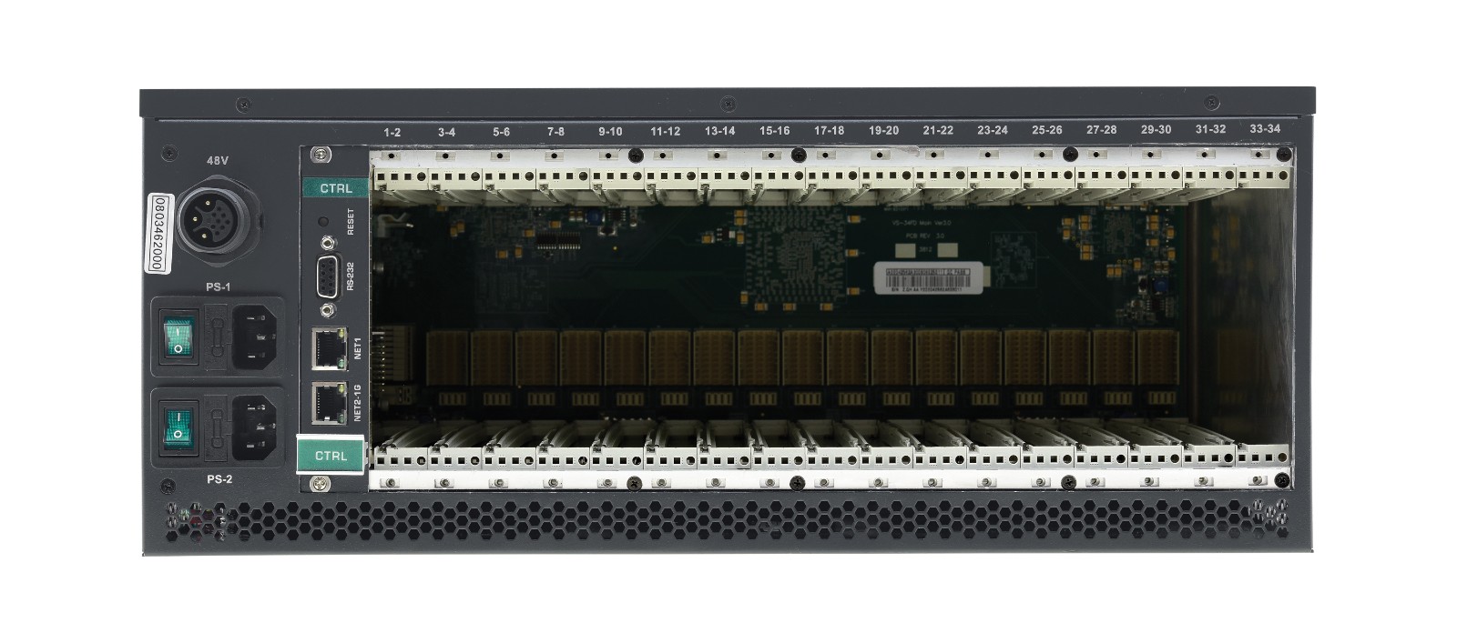 - 模塊化機箱具有17個插槽,用于安裝全系列輸入/輸出模塊,可以填充為2×32、32×2或介于兩者之間的任何其他配置,增量為兩個輸入或兩個輸出。機箱包括一個控制模塊和一個用于可選安裝的附加冗余電源。